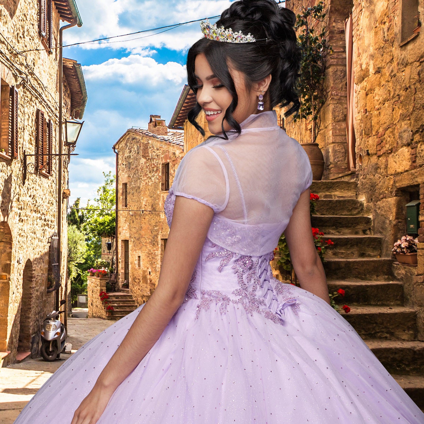 Here's a sensational quinceanera dress found exclusively at QuinceGirl. In scarlet red and lilac purple, this gorgeous quince dress is eye-catching and shimmers with scattered beading. The beautiful sweetheart quinceanera ball gown boasts a fashionable corset detail that laces up for a comfy fit. Thin shoulder straps add support to this lovely beaded quinceanera dress. Layers of crinoline support the voluminous shimmery tulle skirt that flows to the floor in grand fashion. Offered in misses and plus sizes, this corset quinceanera dress includes a removable sheer bolero-style jacket that completes the look for your birthday.